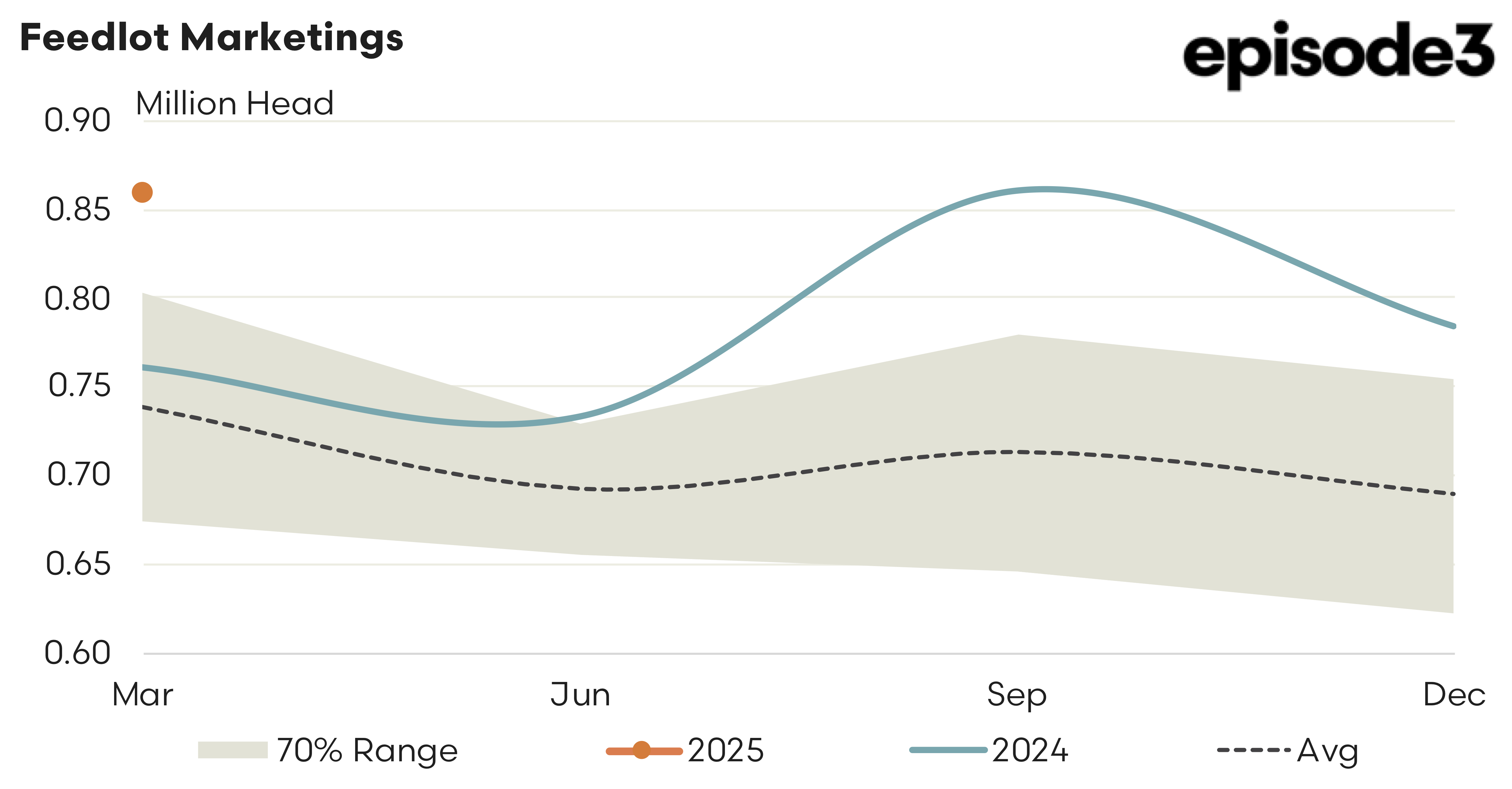 Cattle turnoff has started the 2025 season in a string fashion with 858,613 cattle marketed, this is the strongest start to the season since Q1, 2020 for cattle turnoff from Australian feedlots. Compared to Q1, 2024 this turnoff is nearly 13% higher and it sits 16% above the five-year average turnoff levels for the first quarter of the year.