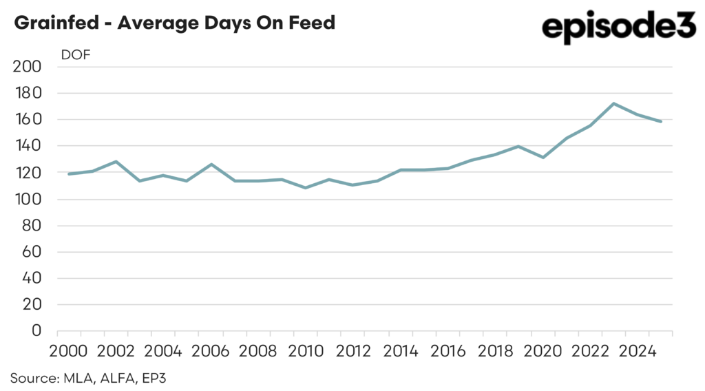 A reduction in longer fed cattle over the last few quarters (particularly Wagyu cattle) has seen the average number of days on feed continue to ease down from 172 days in 2023 to 164 days in 2024. As at Q1, 2025 the average number of days on feed has dropped further to sit at an average of 159 days.