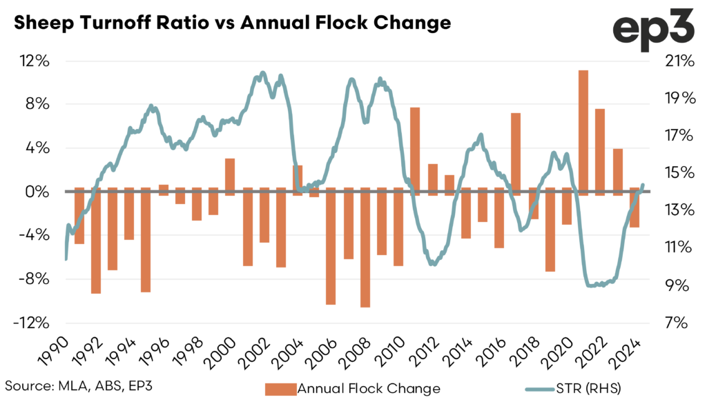 The release of Australian Bureau of Statistics meat production and processing data today allows us to have a peek at what the sheep turnoff ratio (STR) has been doing over the last quarter. At the mid year mark the flock was on the cusp of moving into liquidation territory and now as at the end of Q3, 2024 we have formally crossed the line with the STR moving to 14.4%.