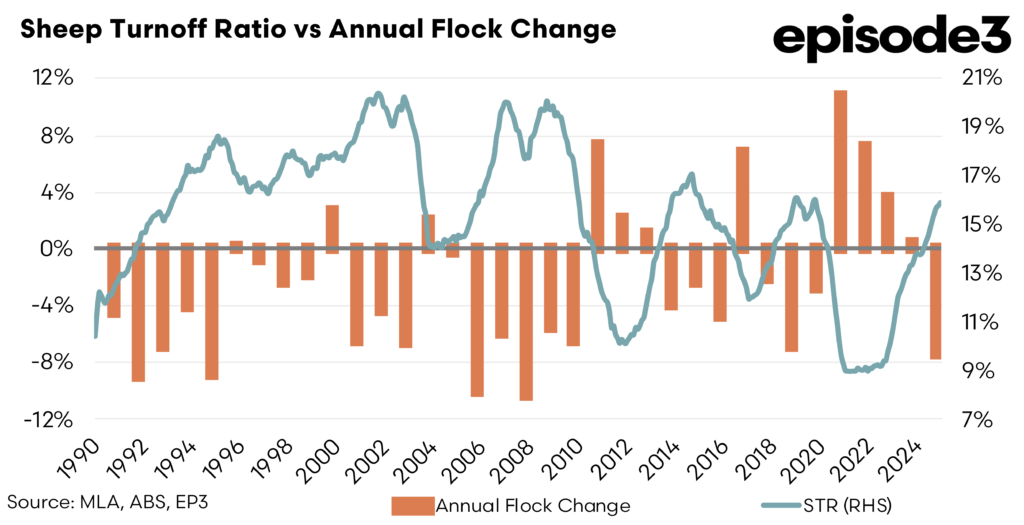The Sheep Turnoff Ratio (STR), a key metric in monitoring the national flock cycle of rebuild and liquidation phases, has now firmly signalled that Australia’s sheep industry has shifted into a liquidation phase.