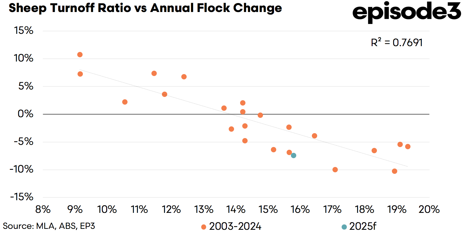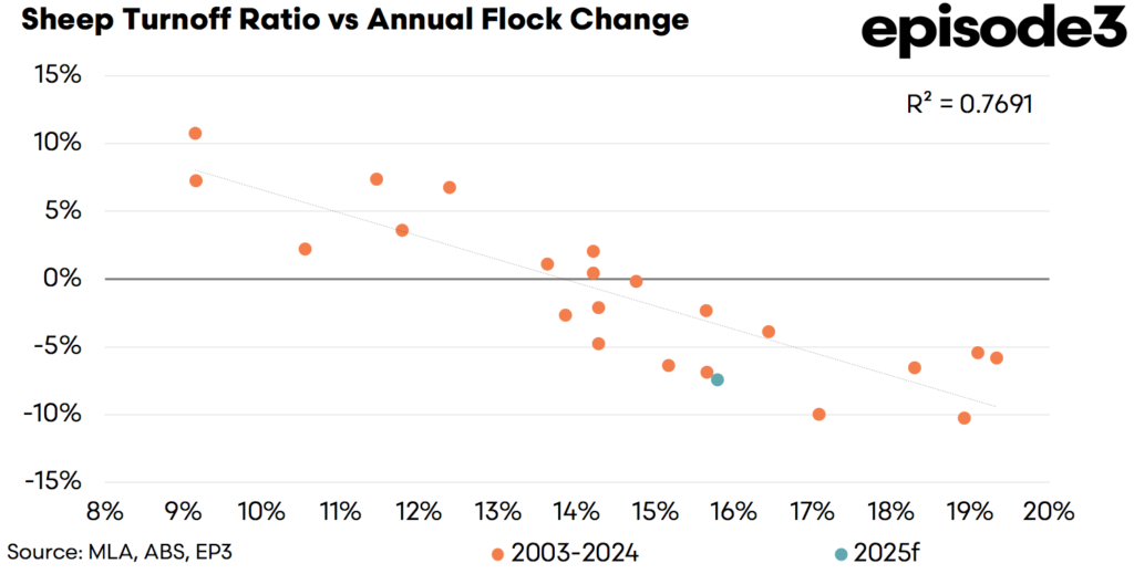 Despite this, Meat & Livestock Australia (MLA) continues to forecast a 7.5% drop in the national flock for 2025, a figure that sits on the higher end of what historical patterns would suggest given the current STR. The scatter plot implies that while a contraction is indeed expected, the magnitude of the decline might be slightly less severe than MLA’s top-end estimate, unless turnoff rates increase further over coming quarters or lambing rates underperform expectations.