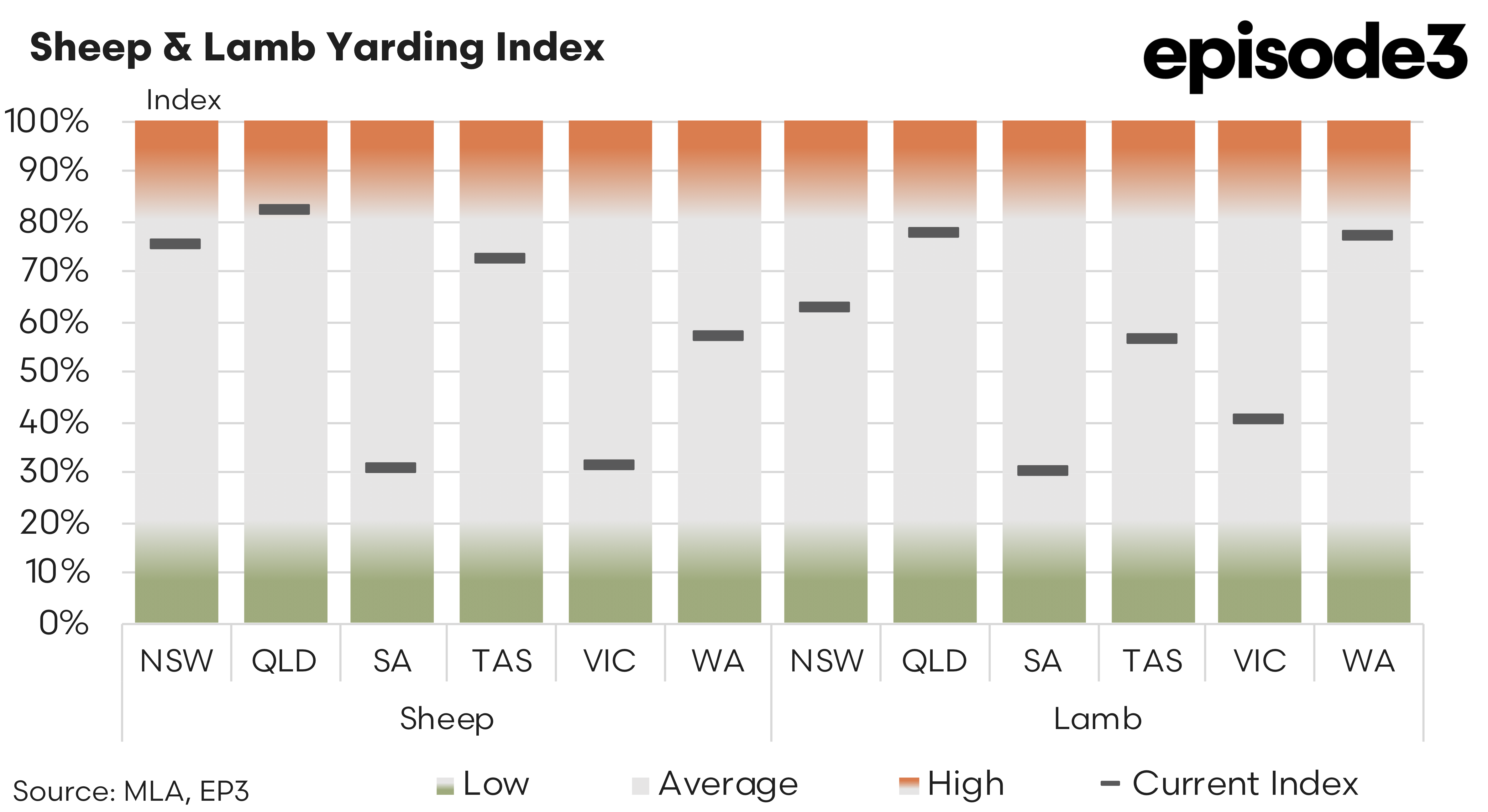 Western Australia stands out as the strongest lamb supply region at present, with the yarding index sitting at 77 percent compared with 67 percent earlier in the period. This suggests that lamb availability remains relatively strong in the west compared with conditions across the eastern states.