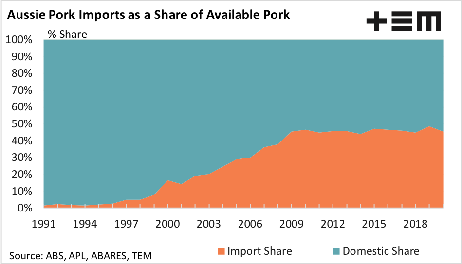 Through the 1990s the local pork sector managed to keep pace with the rise in imported pork product coming into Australia. However, in the mid 2000s the imported pork volumes continued to accelerate while our export focus diminished.