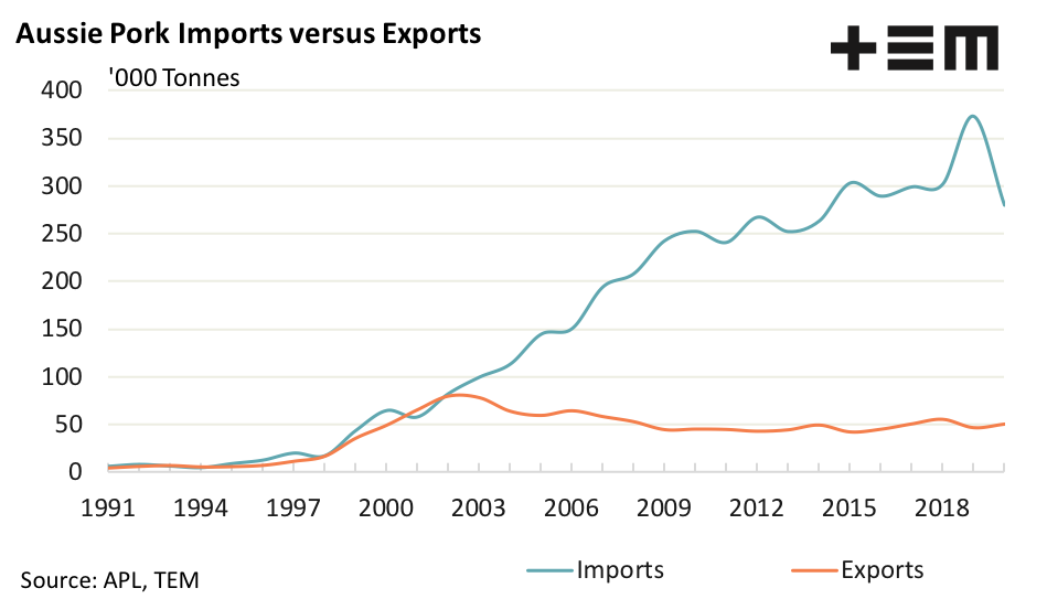 - In 2020 the annual volume of pork imports into Australia equated to nearly 600% of the volume of what was exported.