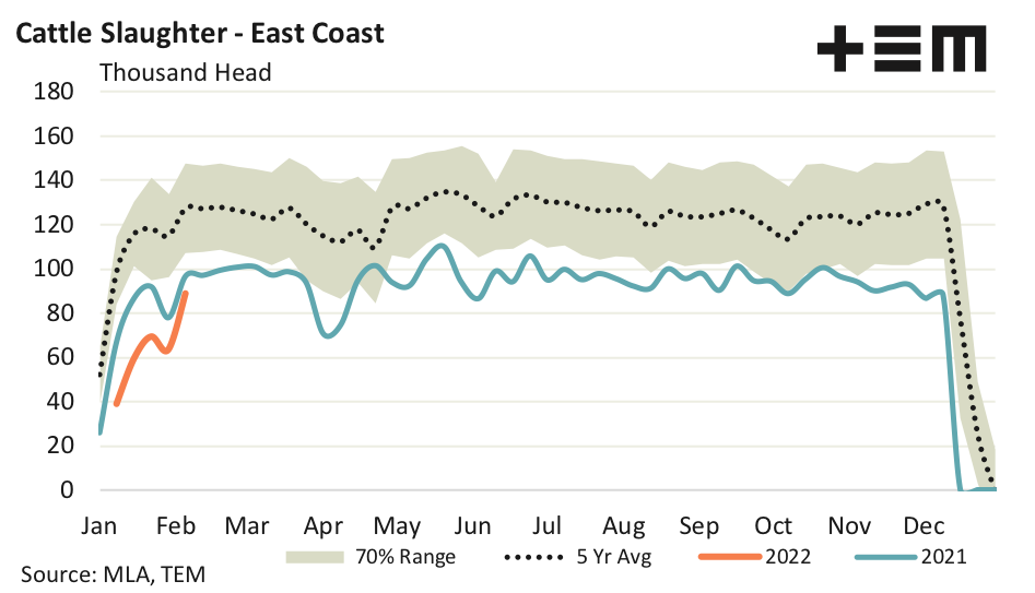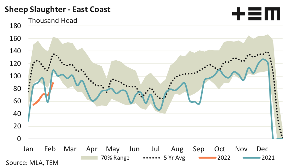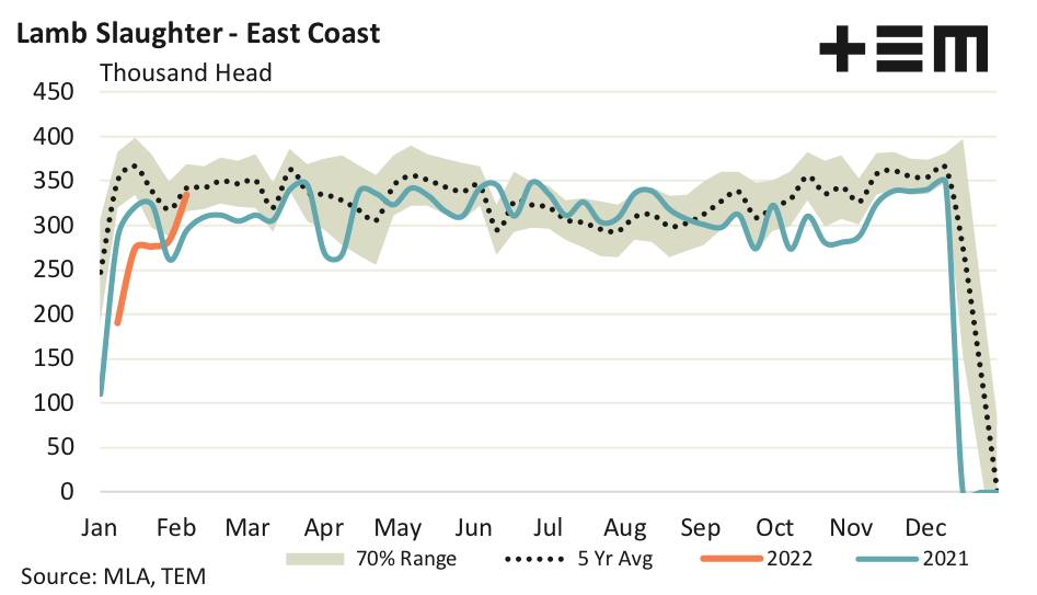 After a very slow start to 2022 Australian red meat processors appear to be slowly getting back into action. Beef, lamb and mutton processing levels have all risen on a weekly basis, but lamb slaughter is showing the most promise when compared to last season’s pattern and the seasonal five-year average trend. East coast lamb slaughter volumes gained 18% on the previous week to hit 334,657 head for the start of February.