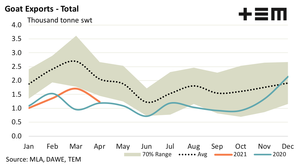 Goat export volumes eased 28% during April to see 1,234 tonnes swt consigned for the month. Australian goat export volumes since the start of 2021 are running 41% under the five-year average trend and has remained outside the lower end of the normal seasonal range (as identified by the grey shaded 70% area) for all of 2021.