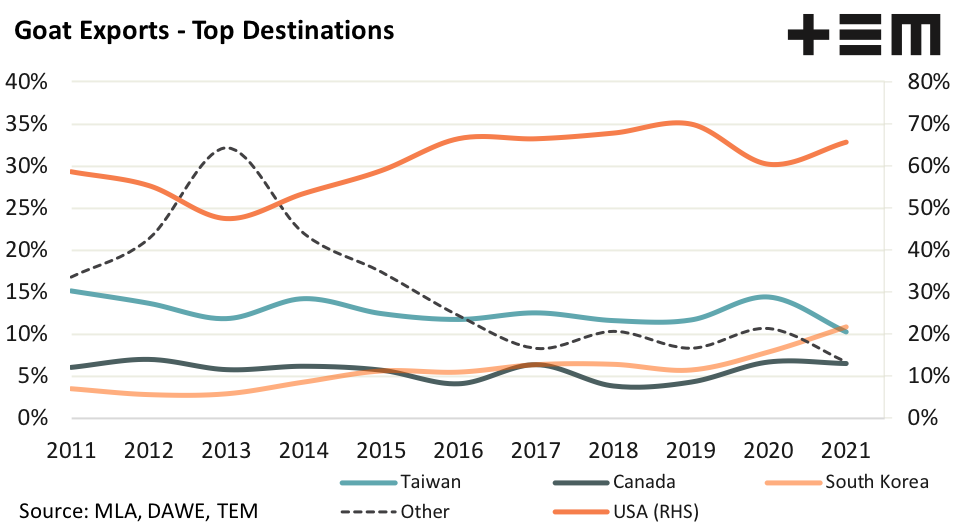 Historically, the USA take most of Australia’s goat meat exports, usually capturing annual market share between 60-70%. This season the American proportion sits at 66%, compared to 11% for South Korea, in second place, and 10% for Taiwan, coming a close third.