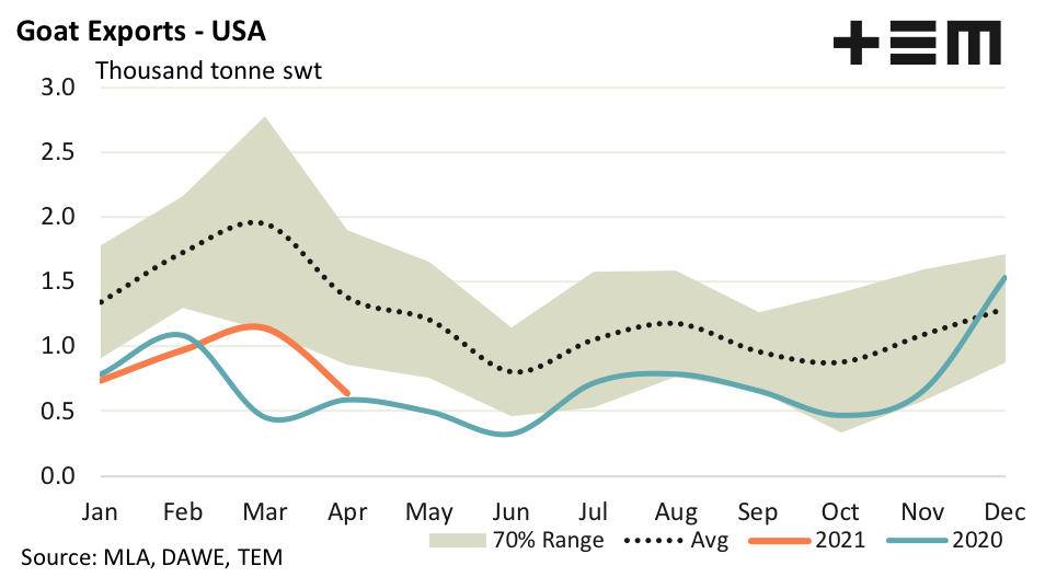 - Historically, the USA take most of Australia’s goat meat exports, usually capturing annual market share between 60-70%. During April 2021 the flow of Australian goat meat exports to the USA declined by 44% to record 642 tonnes shipped.