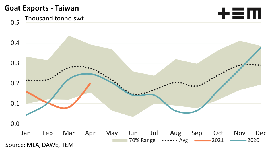 - Despite a 147% lift in goat meat flows to Taiwan from March to April, volumes remain 27% below the average trend.