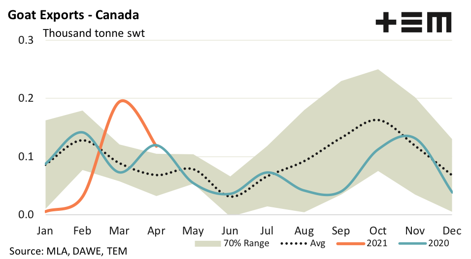 April registered 117 tonnes of Australian goat exports to Canada and despite the reduction in month to month volumes has managed to match levels set during April 2020, which is representative of flows that are 72% above the five-year average for April.
