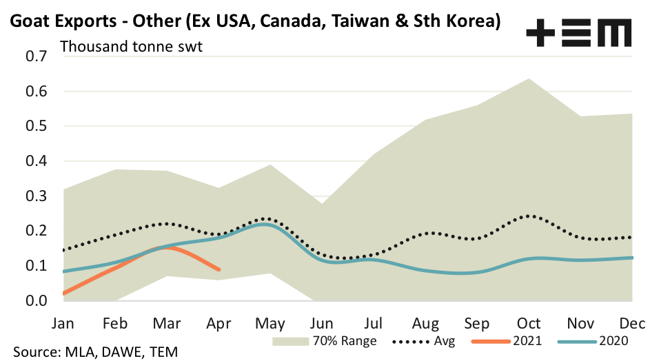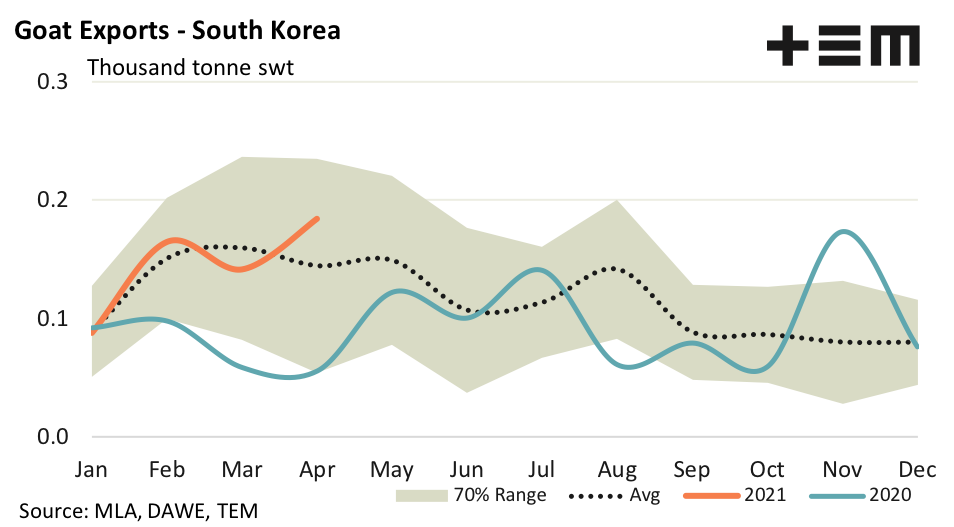 - April 2021 saw the highest monthly flow of Aussie goat meat to South Korea since April of 2018 and represents levels that are 28% above the five-year average for April.