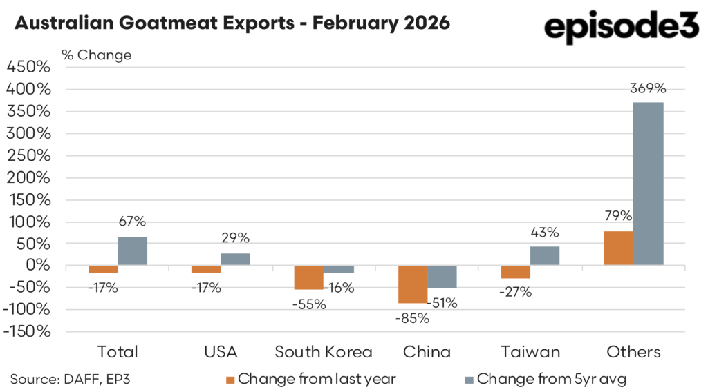 Australia’s goatmeat export performance in February 2026 continued to reflect a market adjusting to shifting demand patterns, with total volumes easing year on year but remaining well above historical norms.