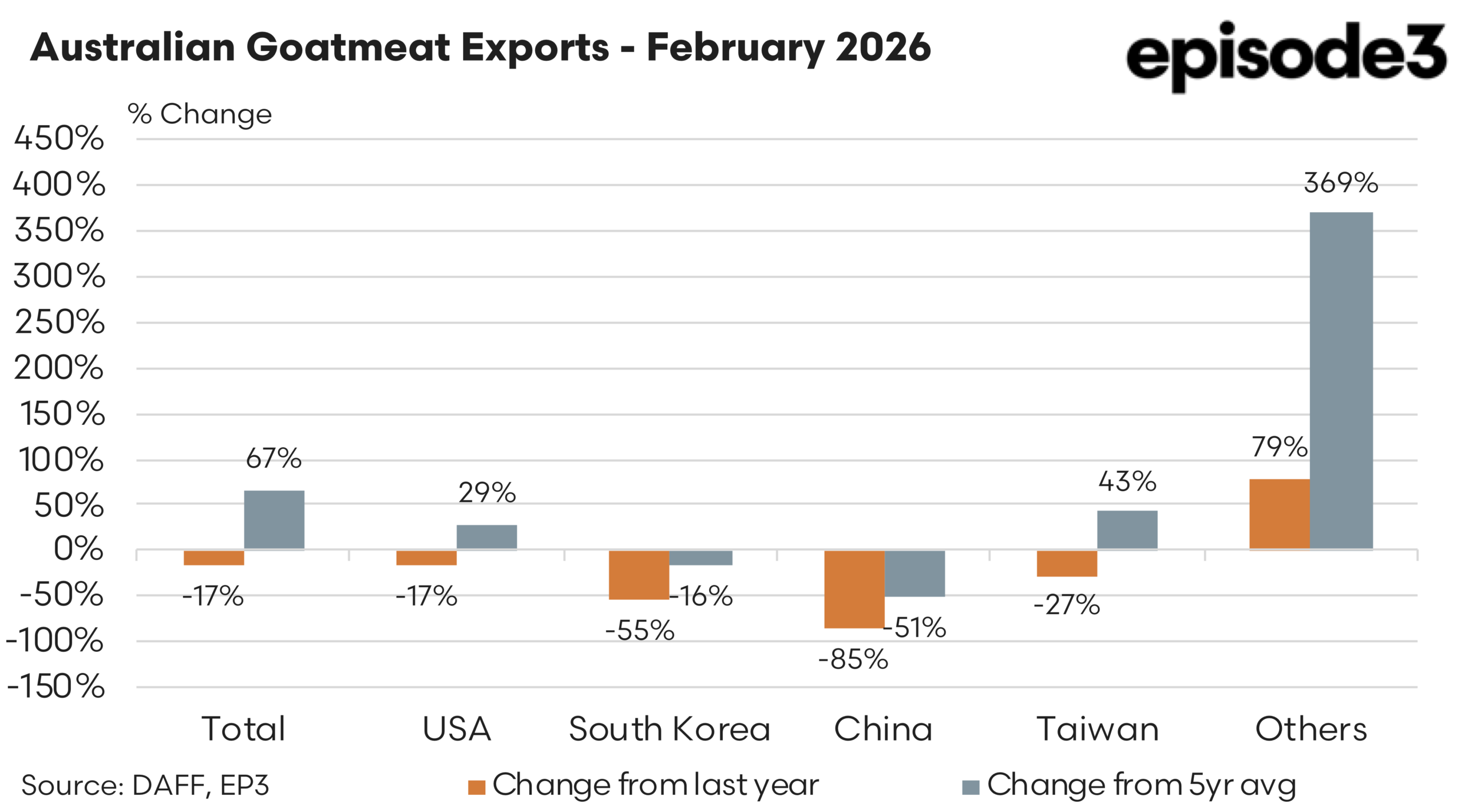 February 2026 reinforces the themes evident in January, which highlighted that the goatmeat export sector is not contracting in a structural sense, but rather redistributing its flows across a broader set of markets. While year on year comparisons remain negative across most individual destinations, the continued strength relative to the five year average highlights the expansion of the industry over time.