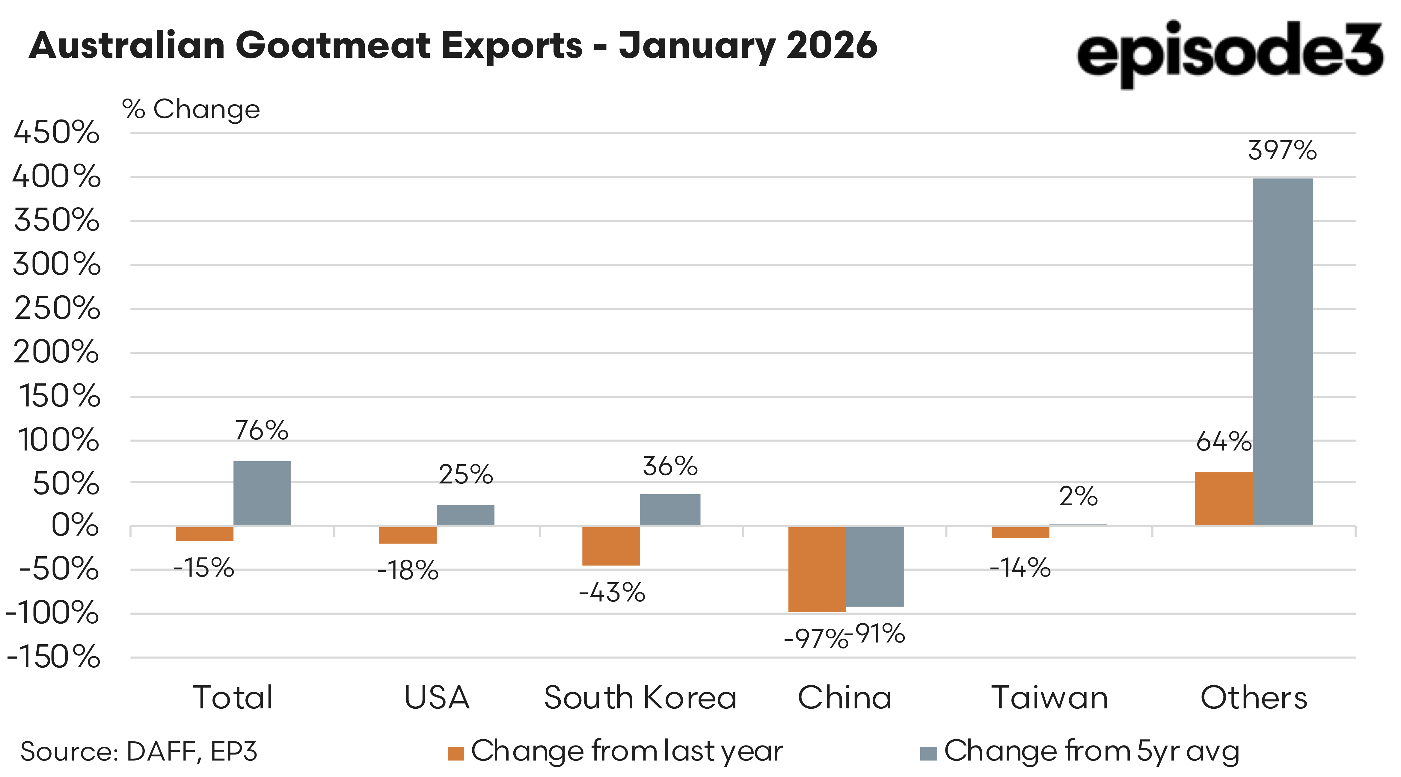 China presented the most dramatic shift in the January data. Exports totalled just 21 tonnes, effectively a collapse in trade compared with last year, with volumes down 97 percent year on year and 91 percent below the five year January average. This near absence of shipments underscores the volatility that can characterise smaller or opportunistic markets in the goat meat trade.