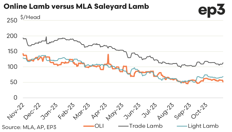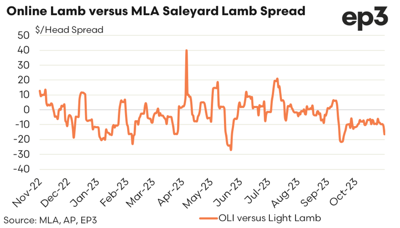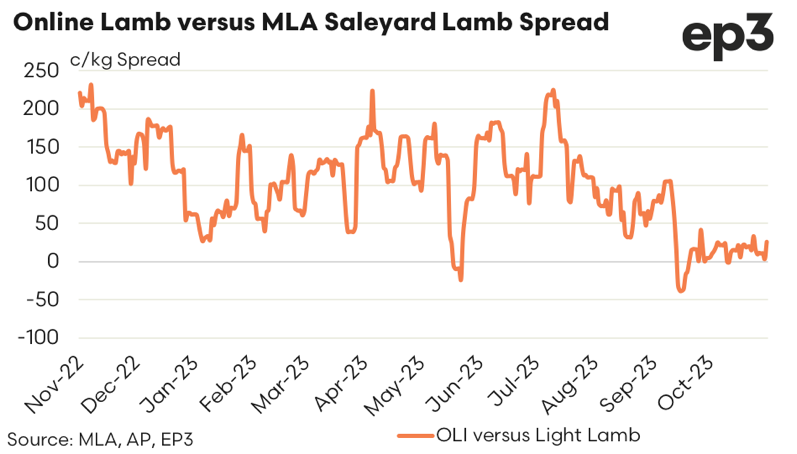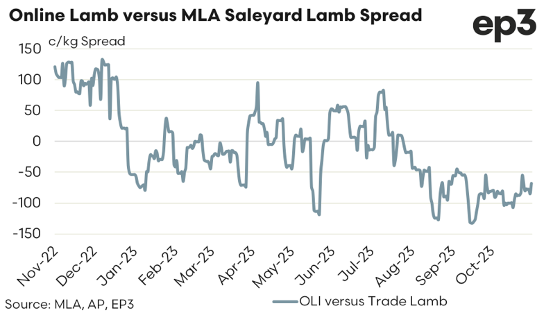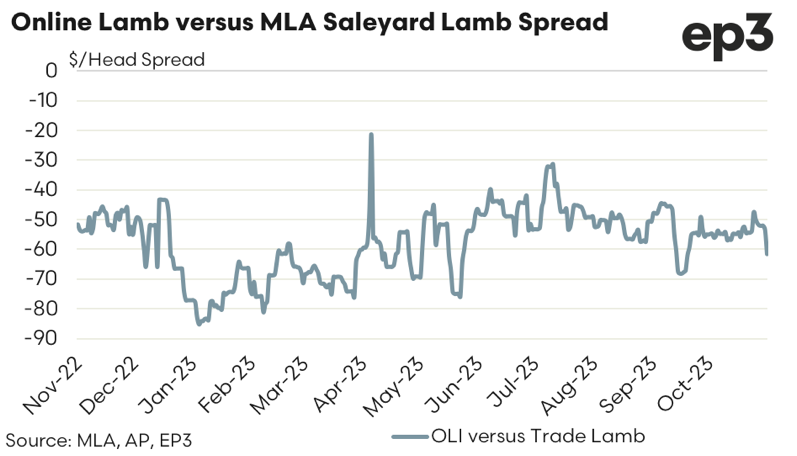 As previously outlined the $/head spread between the OLI and the Trade Lamb Indicator runs at a discount, based on the weight difference of the lambs being sold via online versus saleyard. Over the past year the spread in $/head between the OLI and the Trade Lamb Indicator has ranged between a discount of $30 to a discount of $80, with an average discount since November 2022 coming in at about $58.
