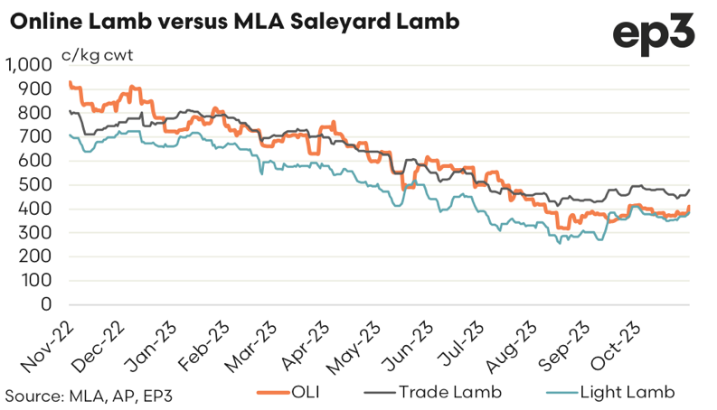 A comparison of each indicator on a cents per kilogram basis highlights that the OLI prices have been a fairly close match to what the MLA Trade Lamb indicator has been achieving over the past year. The exception has been the last few months of 2022, when the OLI ran at a c/kg premium to Trade Lamb and since late August/early September 2023, when the OLI has moved to a c/kg discount to the Trade Lamb Indicator.