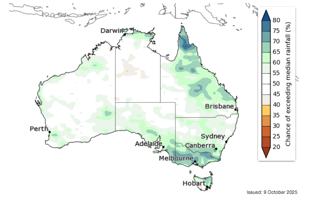 At the same time, the seasonal rainfall outlook suggests that grass availability will not be a limiting factor for many producers this spring. The Bureau of Meteorology’s November to January map points to a 60 to 80 per cent chance of above-median rainfall across much of the eastern seaboard, extending into southern Queensland and northern New South Wales. These conditions favour strong pasture growth, improved weight gains, and lower reliance on supplementary feed which are all factors that enhance trading margins. In previous dry seasons, feed costs or limited paddock capacity often forced earlier turn-off or lower target weights, eroding potential profit. This year, the rainfall probability and pasture outlook provide a handy alignment of feeding potential and market opportunity.