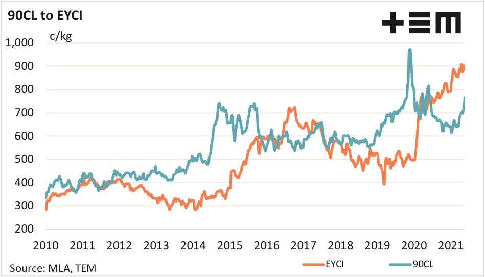 The result of the pick up in demand, both internationally and domestically in the US, saw the 90CL beef export price indicator rally nearly 5% to bring it to the highest point since June 2020 at 763c/kg and closing some of the discount that had opened up between the 90CL and the Eastern Young Cattle Indicator (EYCI) during the 2021 season.