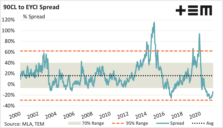 - Currently, the annual average spread of the 90CL to EYCI sits at a discount of 23.4%, which is consistent with levels that would be expected given Australia’s low forecast beef cattle slaughter volumes.