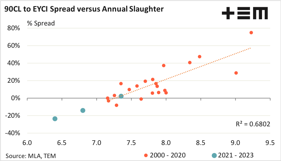 Analysis of the historic annual average spread between the 90CL and the EYCI compared to the annual cattle slaughter volume demonstrates that slaughter can be a good predictor of spread behaviour. During periods of high annual slaughter (above 9 million head per annum) can see the 90CL run at premium spread levels beyond the 60% premium spread boundary. Similarly, very low annual slaughter volumes can push the spread to relatively wide discounts.