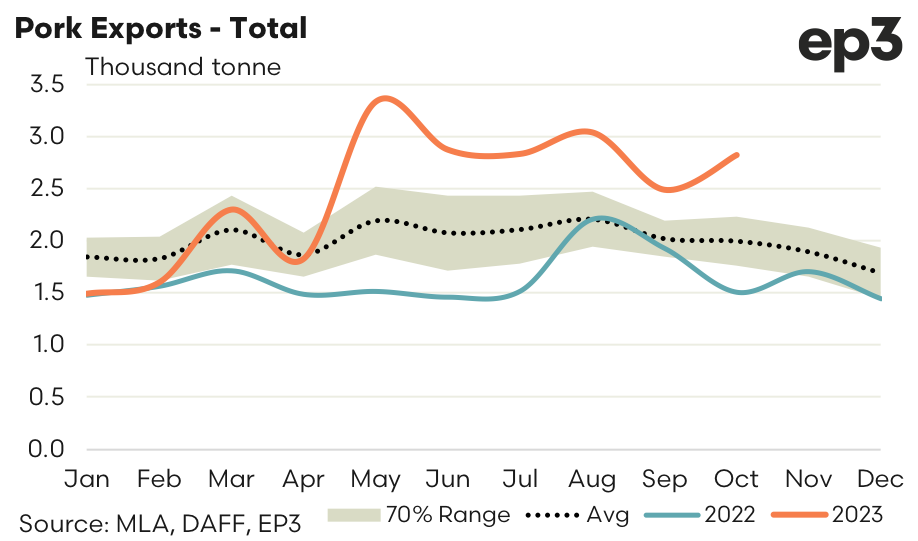 However, after April export flows for Aussie pork roared into life and has remained elevated through to October. To date, average monthly exports of pork during 2023 has been nearly 2,500 tonnes per month. Compared to last year export flows from January to October are nearly 51% higher and 22% above the monthly pattern set by the five-year average seasonal trend.