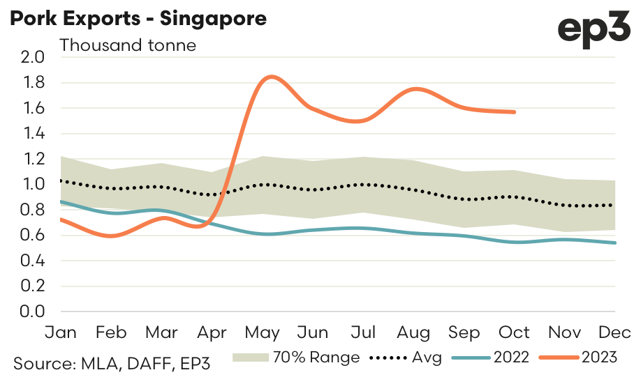 Singapore – Mirroring the pattern set by the total pork flows, demand for Aussie pork in Singapore started 2023 in a subdued fashion with average monthly volumes from January to April running about 28% under the five-year average seasonal trend. However, since May the demand has improved significantly with average monthly flows from May to October sitting 73% above the five-year seasonal pattern.
