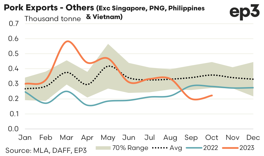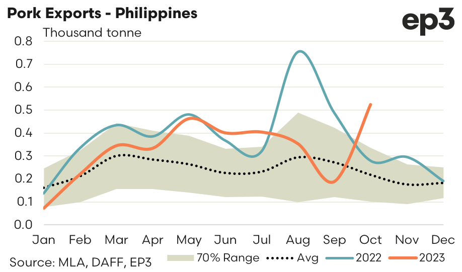 Philippines – Apart from a weak start to 2023 and a dip in volumes during September the remaining months for 2023 have seen above average pork exports from Australia to the Philippines. Compared to the five-year average pattern the trade over 2023 has been running nearly 35% higher this year. Although, compared to 2022 export volumes to the Philippines are down by 17% this year.