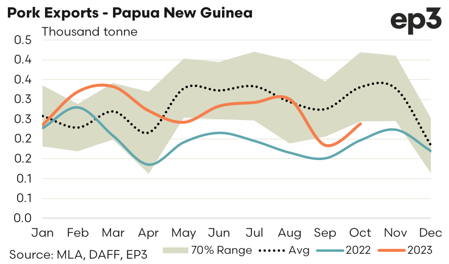 PNG – Papua New Guinea saw a rather subdued 2022 in terms of Aussie pork demand with average monthly volumes running 30% below the five-year average trend last year. So far in 2023 trade volumes to PNG are averaging monthly flows that are nearly 37% higher than the volumes seen exported in 2022, but are still 6% under the five-year average seasonal pattern.