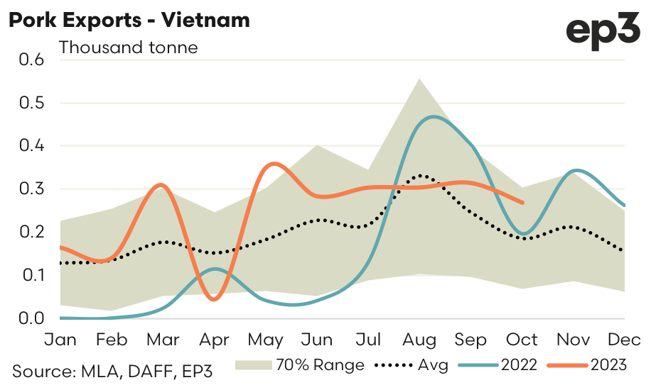 Vietnam – There was a brief dip in Aussie pork exports to Vietnam during April 2023, but other than this most months during this year have seen above average flows recorded. Compared to the five-year seasonal average pattern pork exports to Vietnam have been 25% higher during 2023 and 77% stronger than the levels seen during 2022.