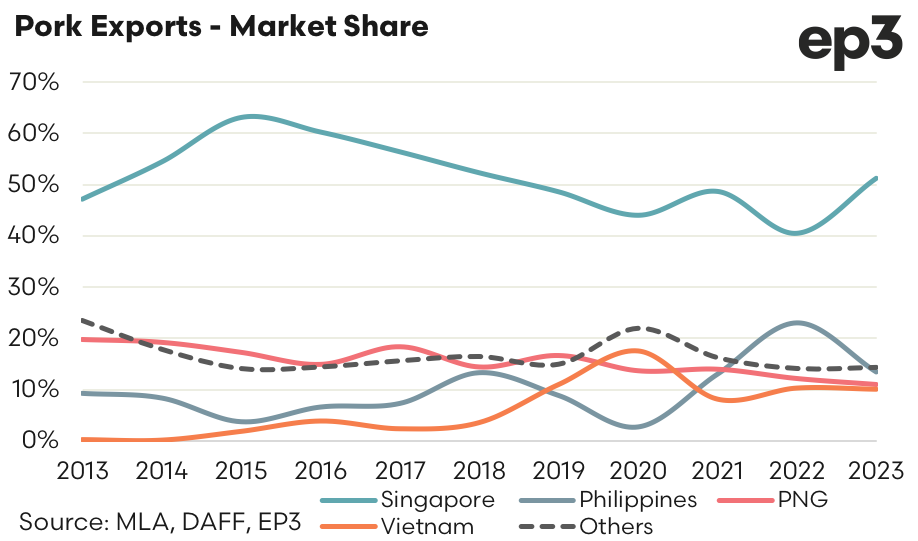 Analysis of the market share of Australian pork exports highlights that Singapore is the dominant trade destination, accounting for 40%-60% of the trade most years. So far in 2023 Singapore has taken 51% of total Aussie pork exports. The Philippines sits in second top place for Aussie pork exports accounting for nearly 14% of the trade flows during 2023. Meanwhile Papua New Guinea (PNG) and Vietnam are battling it out for third place sitting on 10.9% and 10.1% of total pork exports this year, respectively.