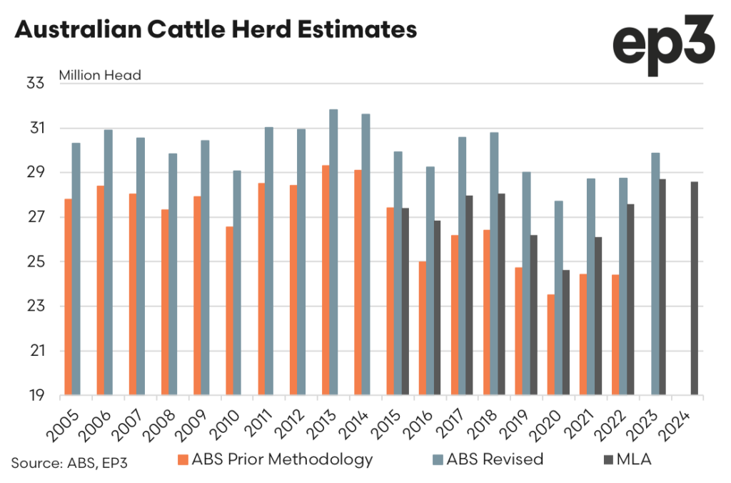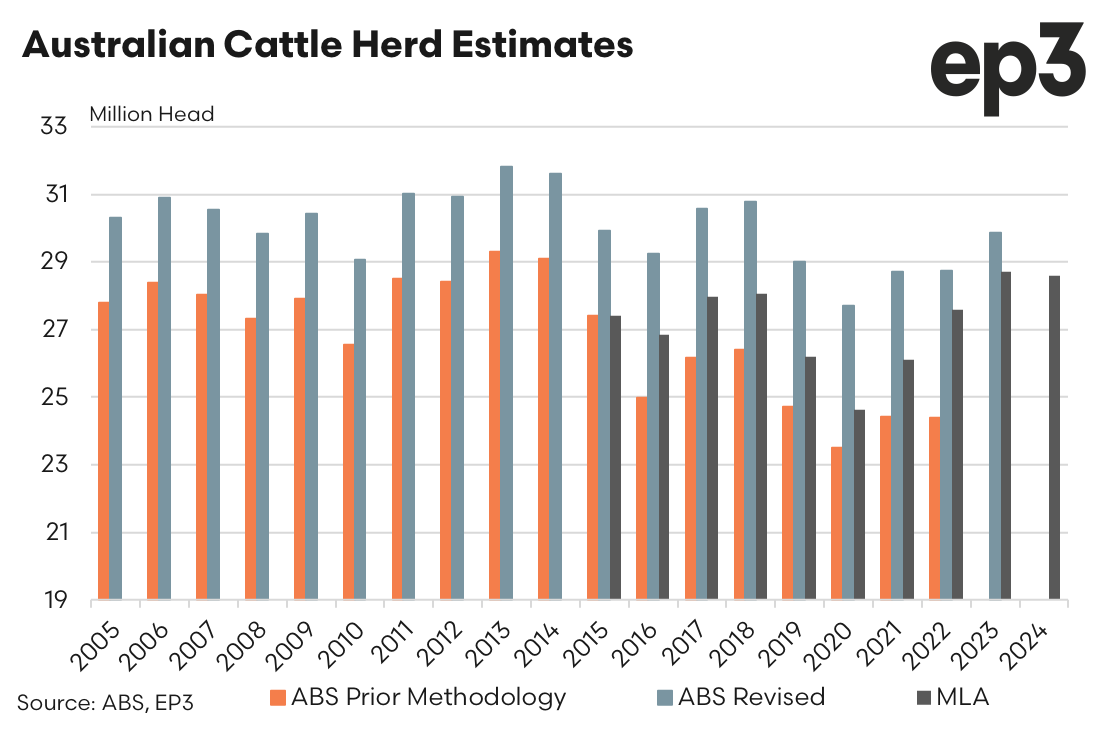 The Australian Bureau of Statistics (ABS) has significantly revised its estimate of the beef herd size in Australia. The new estimate for the end of June last year is 27.8 million head, up from the previous estimate of 24.4 million—a difference of 3.4 million head, or 14%. This adjustment addresses criticism over the past two years regarding the accuracy of herd estimates.