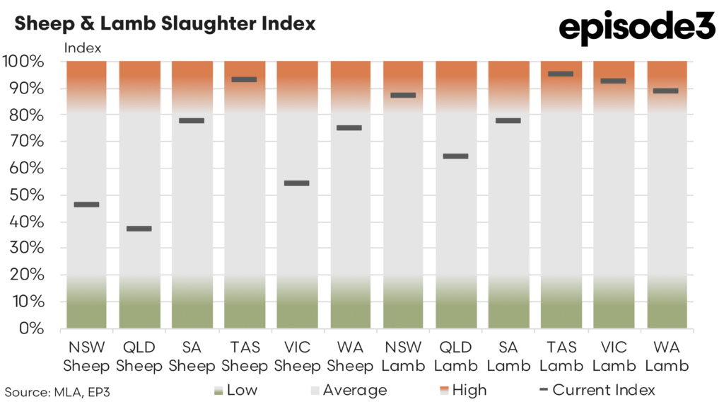 Sheep processing volumes have pulled back sharply in several states. In New South Wales, the sheep slaughter index dipped from 86% in March to just 46% in April. Queensland also saw a significant drop from 72% to 37%. South Australia lifted from 73% to 78%, recording only a modest increase. Western Australia declined slightly from 79% to 75%, while Victoria actually lifted from 42% to 54%. Tasmania recorded the most substantial increase, with its sheep slaughter index jumping from 80% to 93%, suggesting strong end-of-season clearance in the state with processors there potentially getting ahead of Easter/Anzac holiday closures.