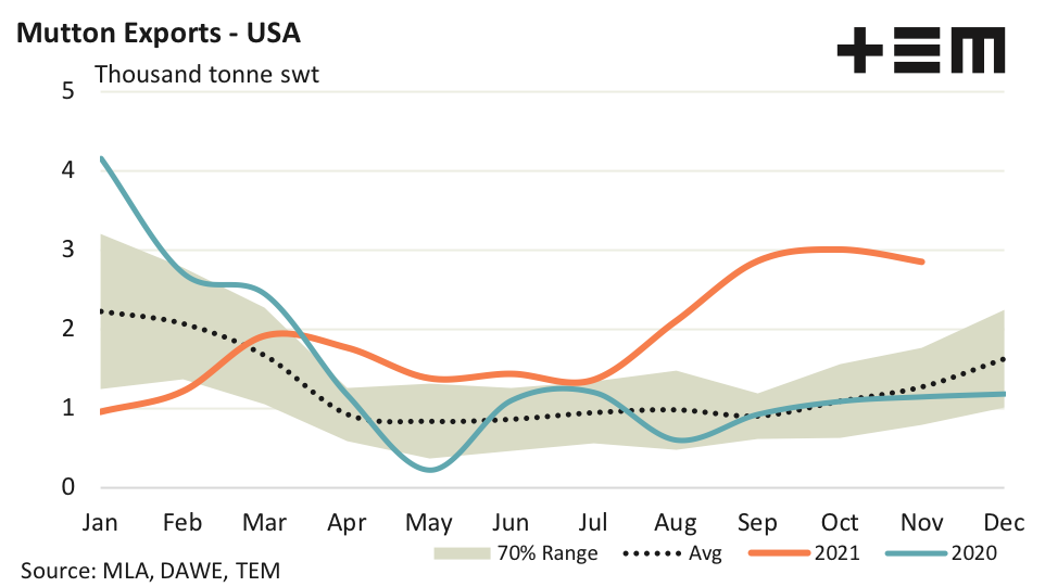 - November 2021 Aussie mutton export trade flows to the USA are running 124% above the five-year average pattern for this month in the season.
