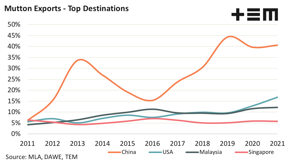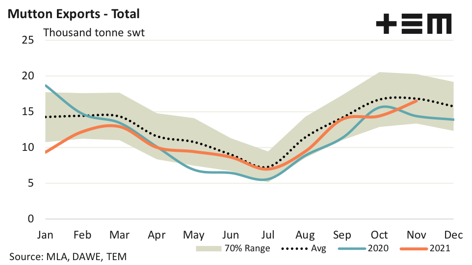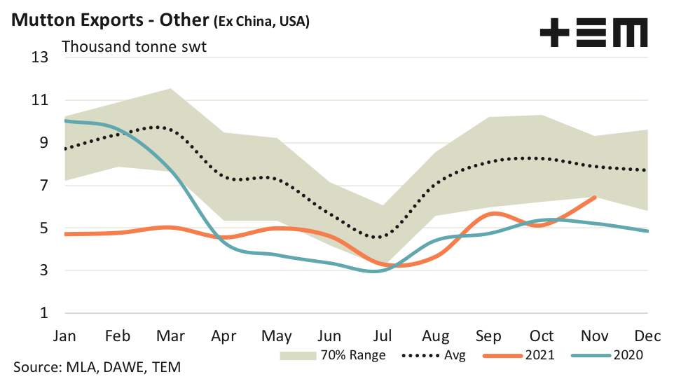 - Despite the relatively strong performance over 2021 for the USA and China, total Australian mutton exports are averaging monthly levels that are about 12% under the five-year seasonal pattern.