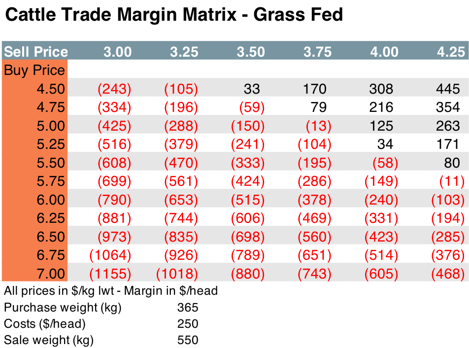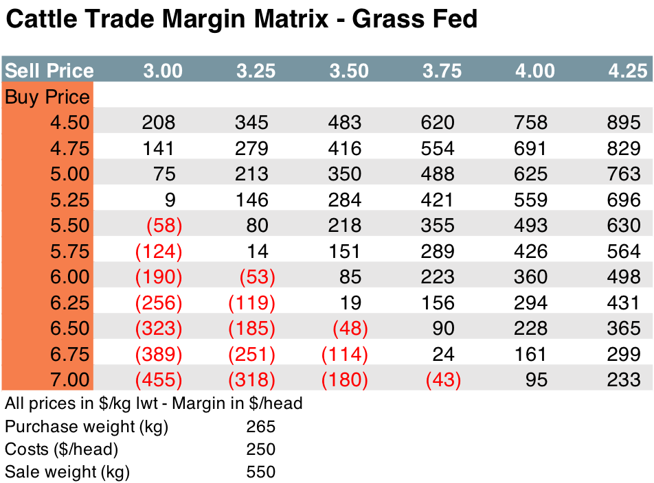 The first grass fed trade assumes a purchase weight of 265kg live weight for weaners purchased, to be carried until 550 kilogram live weight before sale. The matrix highlights the profit/loss in dollars per head achieved on the trade based on a set of theoretical buy and sell prices, after taking into account $250 per head of costs such as transport, agents fees, vet services, etc.