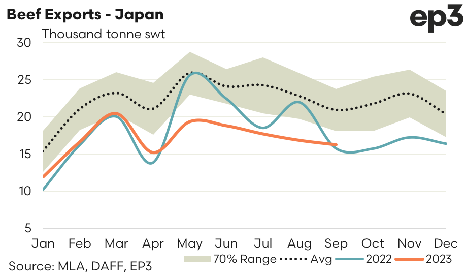 - Japan – There was a further 3% decline in Aussie beef exports to Japan seen from August to September and the lowest month for beef exports reported since the April 2023 lull with 16,276 tonnes reported shipped to Japan during September 2023. This season saw similar beef export volumes as last September and current trade levels are sitting around 22% under the five-year average for September.