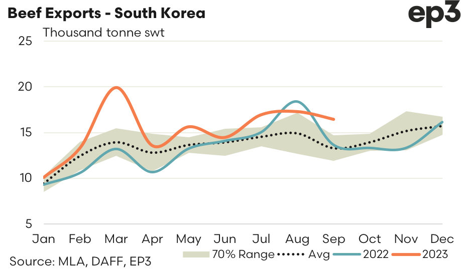 - South Korea – There was a 5% easing in beef export volumes to South Korea from Australia during September to see 16,463 tonnes reported shipped. While it was a softer outcome than August the current trade flows remain above the five-year September average by nearly 24%, so it isn’t too bad a result with the historic flows in mind. As the trend this season demonstrates the Aussie beef trade to South Korea remains positive and running above the average seasonal pattern.