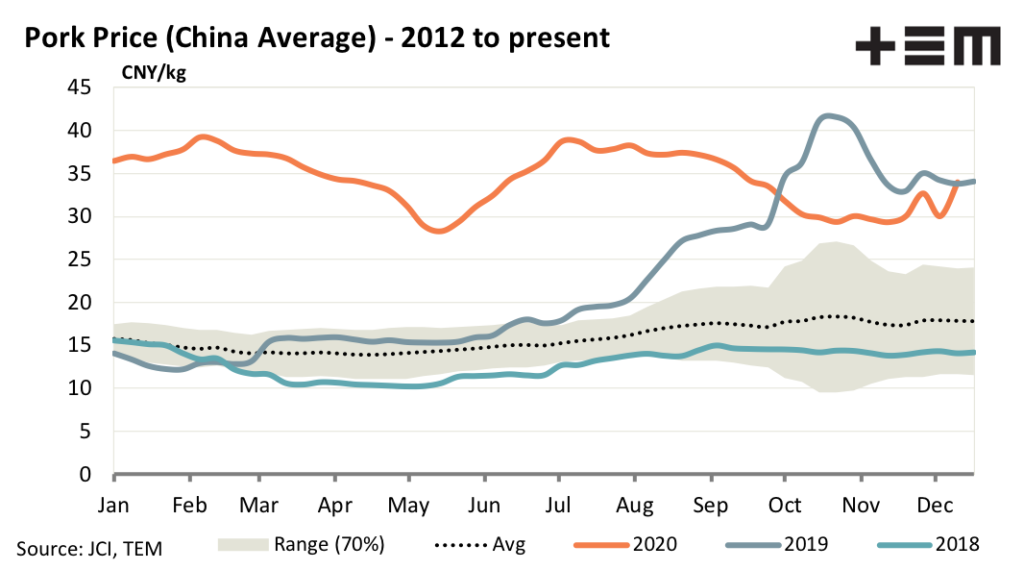 During 2020 Chinese demand for Australian sheep meat remained strong. Despite some recent suggestions that China may be targeting Aussie sheep meat in an escalation of trade tensions there has been little evidence of this occurring. Given the reliance the global sheep meat export sector has on Australian sheep meat (circa 40% of global sheep meat demand is satisfied by Australia) there is limited scope for China to shun the Aussie supply, particularly while their pork meat production gap remains.