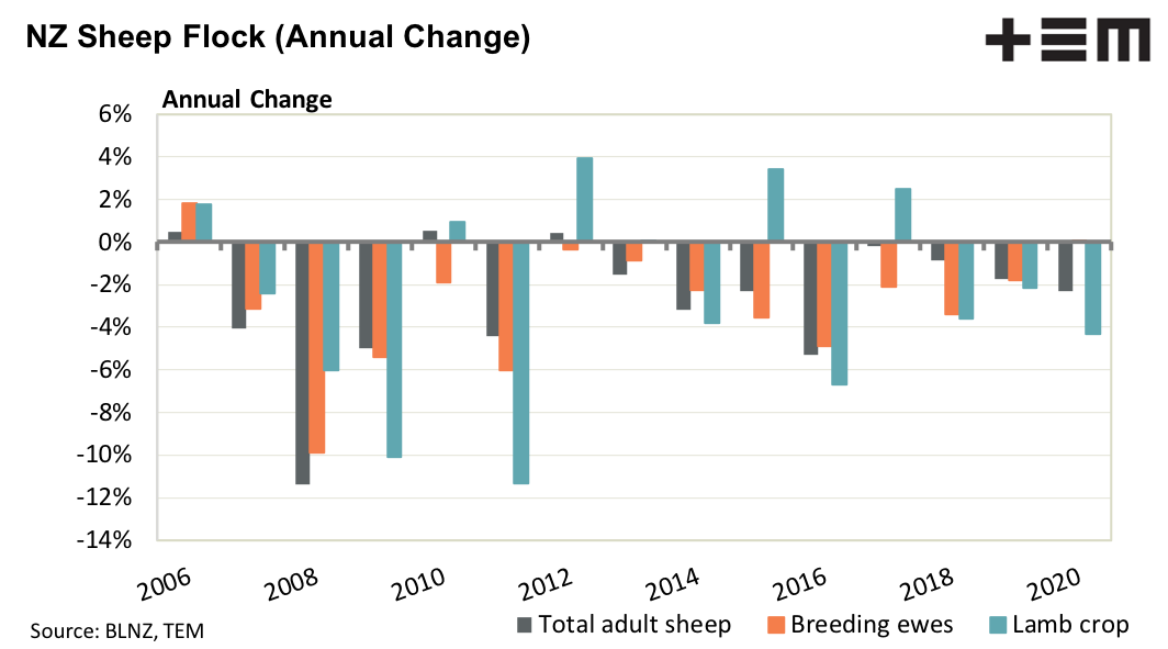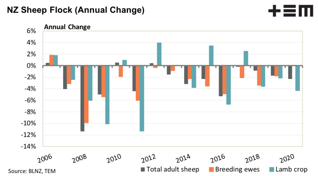 The sheep flock in NZ has been in steady decline for more than three decades with sixteen of the last eighteen seasons posting an annual decline in the number of breeding ewes.