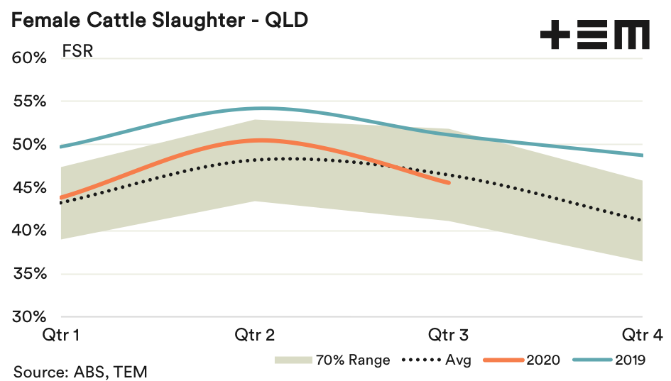 Analysis of the FSR at a state level shows that Queensland is heading in the right direction for a herd rebuild, with the FSR dipping below the average seasonal trend to see it at 45.5% for the September quarter.