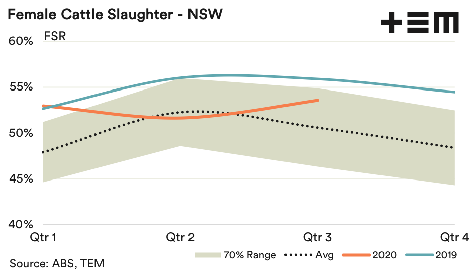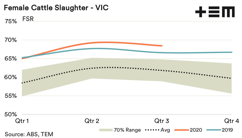 Victorian female cattle slaughter ratios remain stubbornly elevated. Indeed, the 2020 trend is running above the levels seen during 2019. The September FSR in Victoria has come in at 68.4%, down marginally from the 69.2% recorded in the June quarter, but still well above the normal seasonal range that could be expected for this area.