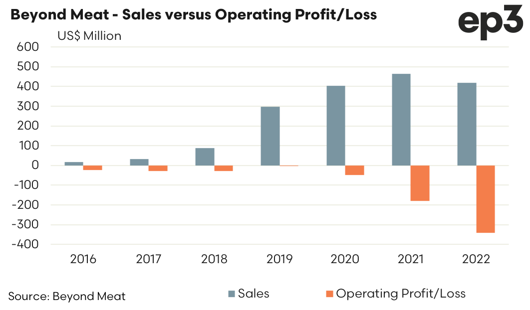 Beyond Meat have just released their full year results for 2022 and these highlight that their woes aren’t yet over. During 2022 sales dropped by 10%, down from $US464.7 million in 2021 to $US418.9 million in 2022. However in more concerning developments, their operating losses grew by 92% from a loss of $US179.7 million in 2021 to a loss of $US342.8 in 2022.