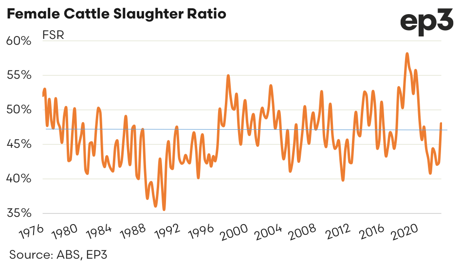 The Australian Bureau of Statistics livestock slaughter data was released today for the June quarter 2023. It shows the female slaughter ratio (FSR) for cattle has breached the 47% tipping point between herd rebuild and herd liquidation.