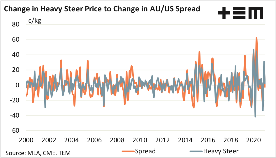 - The price spread between Australian heavy steers and US Live cattle futures has approximately 30% more volatility than the monthly movement in the Australian heavy steer price, on average.