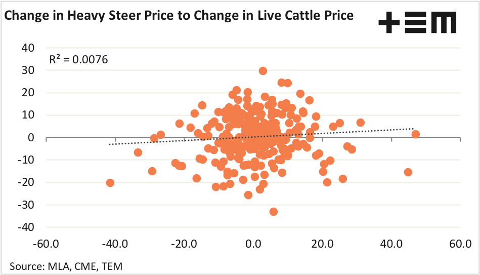 Indeed, monthly data since 2000 shows that the spread has approximately 30% more volatility than the monthly movement in the Australian heavy steer price, on average. This indicates that Aussie beef producers using US Live Cattle futures to hedge would open themselves up to the potential of more price risk, rather than less.