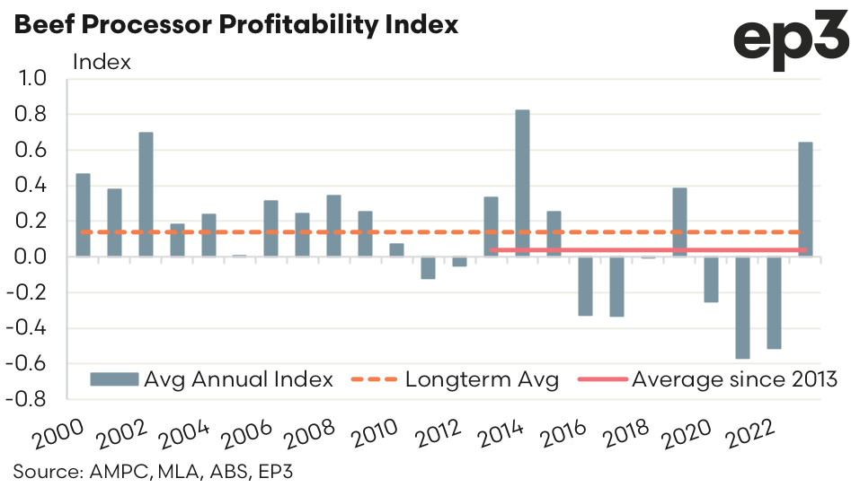 A comparison of ABARES annual beef farm profitability data compared to the beef processor index highlights that the pendulum of profitability has indeed swung in favour of the processor into 2023. ABARES are yet to release their calculations for 2023, but given the pattern set over the last decade it is fair to assume that beef farm profitability will be down from the record peak seen in 2022.