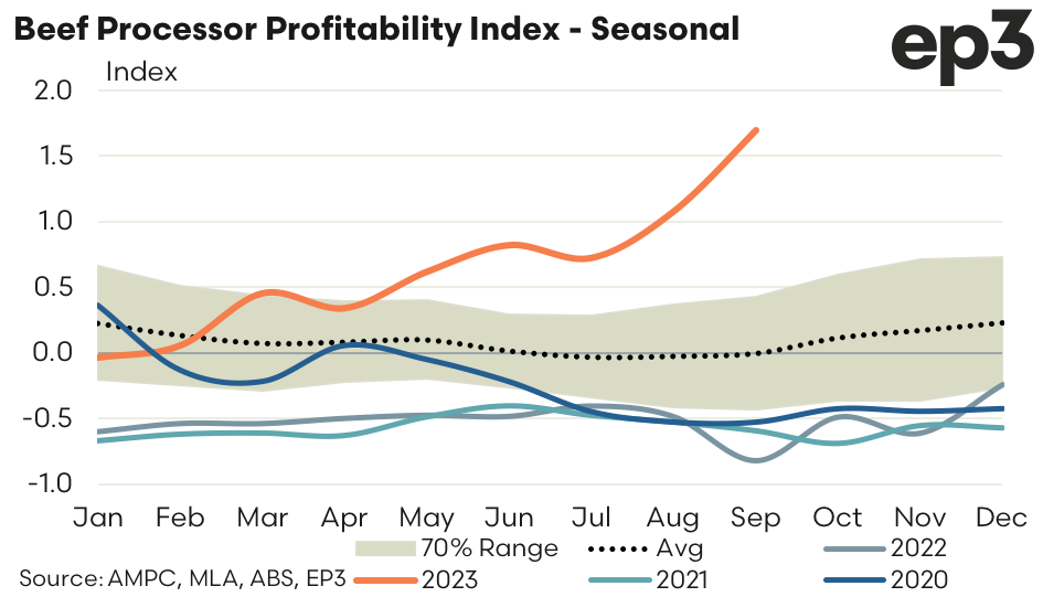 - The EP3 Beef Processor Profitability Index (BPPI) has moved to a high of 1.69 during September 2023, which is the highest this level has been since 2000.