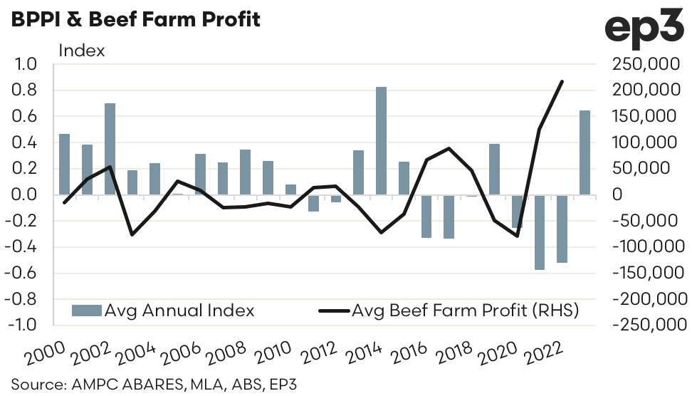 - A comparison of beef farm profitability versus the BPPI highlights that when beef farms are making good profits beef processors are having a tough time. Similarly, when the pendulum swings in favour of the beef processor it becomes the beef producers turn to tighten the belt and much of what drives this pendulum is cattle supply.
