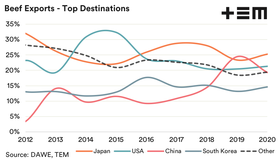 - China has dropped from first spot for market share of Australian beef exports in 2019 to third place this season, moving from 24.4% of total export volumes to 19.3%, sitting behind Japan and the USA.