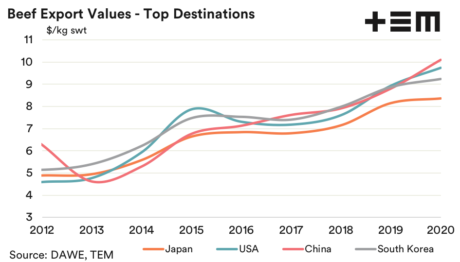 Indeed, a comparison of the top four beef export destinations for Australia shows that in recent years the average value of beef consignments to China have outperformed product exported from Australia to the USA, South Korea and Japan.